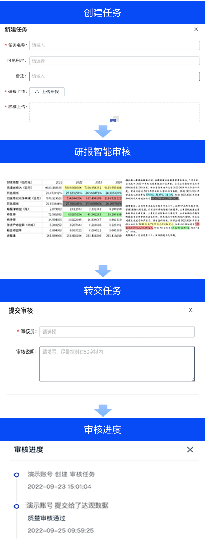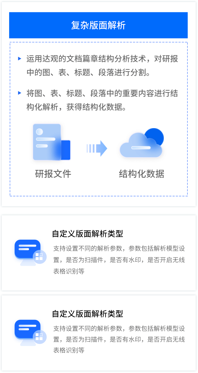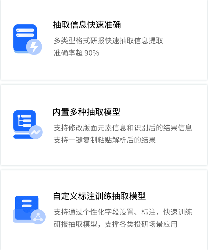 智能研报审核系统是达观数据为券商研究所、买方研究机构等用户打造的集研报解析、抽取、审核、管理功能为一体的产品。集成OCR、NLP、机器学习等技术,对研报和底稿信息进行多方面抽取,并对研报进行数据、文本、观点等全方位的自动化审核, 同时对研报和底稿进行规范化、流程化管理,帮助用户提升工作效率,把控研报发布的时效性和合规性,全面降低出错风险。