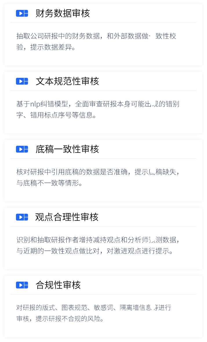 智能研报审核系统是达观数据为券商研究所、买方研究机构等用户打造的集研报解析、抽取、审核、管理功能为一体的产品。集成OCR、NLP、机器学习等技术,对研报和底稿信息进行多方面抽取,并对研报进行数据、文本、观点等全方位的自动化审核, 同时对研报和底稿进行规范化、流程化管理,帮助用户提升工作效率,把控研报发布的时效性和合规性,全面降低出错风险。